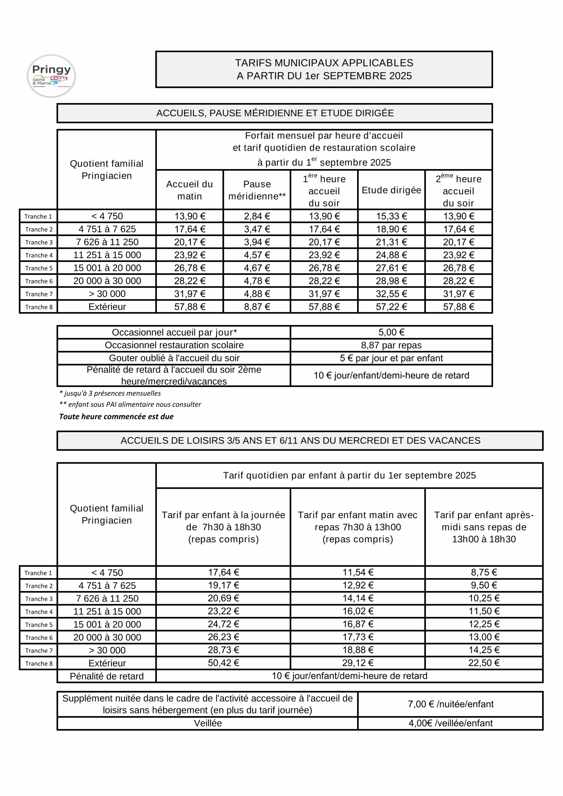 Accueil > Écoles > Tarifs Des Services Municipaux