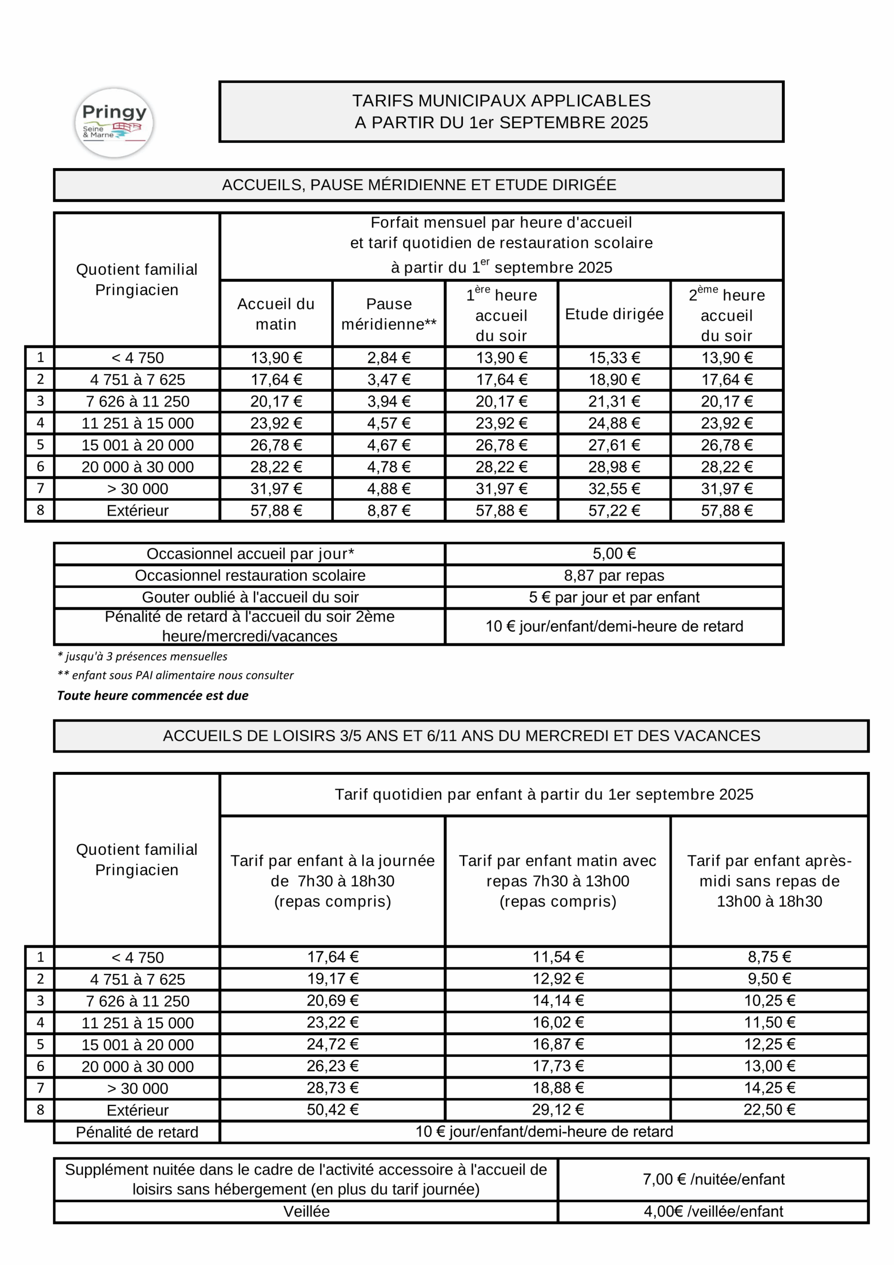 Accueil > Écoles > Tarifs Des Services Municipaux